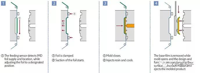 模內電子(IME)工藝將電氣功能通過印刷和表面貼裝集成于柔性薄膜上制備功能化薄膜,再通過模內覆膜工藝制成產品。其工藝過程為: