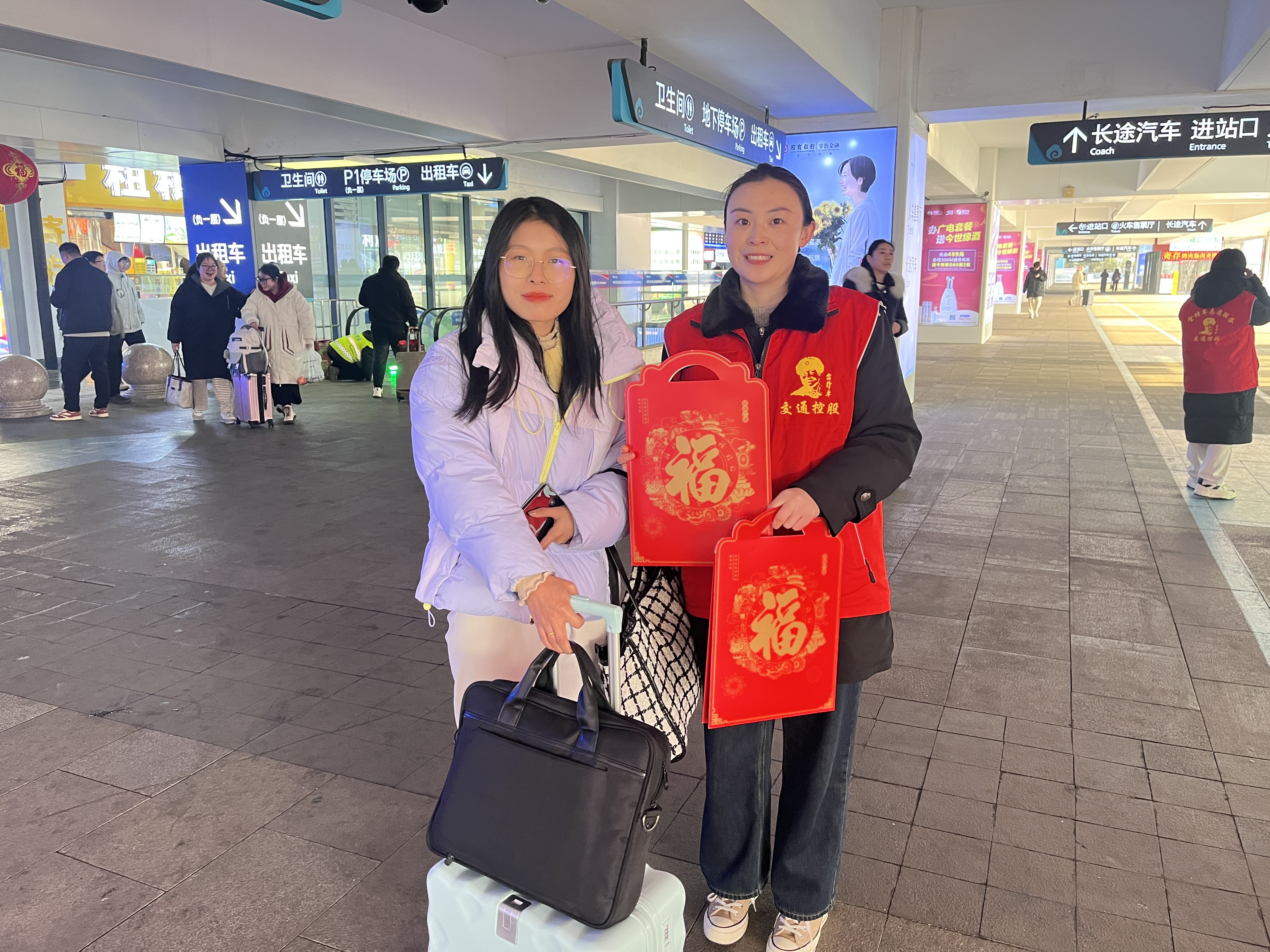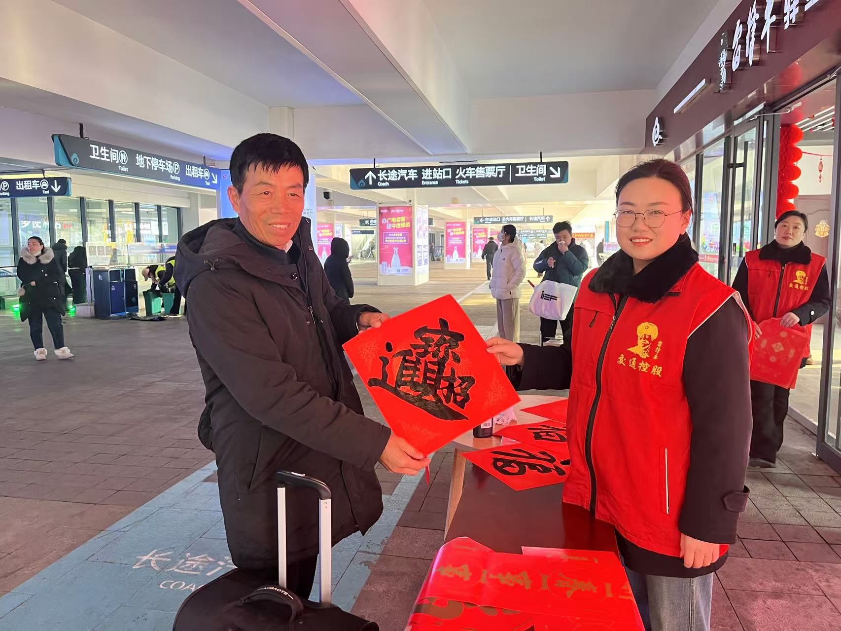 很快,旅客們紛紛圍攏過來,挑選自己心儀的春聯(lián)?,F(xiàn)場氣氛熱烈而溫馨,大家臉上都洋溢著喜悅的笑容。在外務工歸家的張先生拿著剛剛挑選到的春聯(lián),激動地說道:“在回家的路上能收到這么喜慶的春聯(lián),心里別提多暖了,感覺新年的氛圍一下子就濃了。” 志愿者們穿梭在人群中,一邊幫忙遞春聯(lián),一邊與旅客親切地嘮著家常,詳細詢問他們的返鄉(xiāng)路程,還不忘貼心地囑咐他們注意旅途安全。